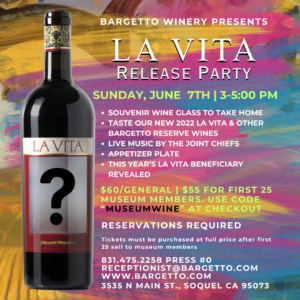 Bargetto Winery is happy to allocate 25 La Vita Release Party tickets to members of the Santa Cruz Museum of Natural History at the same pricing as the winery’s Wine Club member tickets. To purchase tickets at member pricing, use the coupon code “MuseumWine” at checkout under “Order Details,” but be sure to select a “general” ticket using the link below.